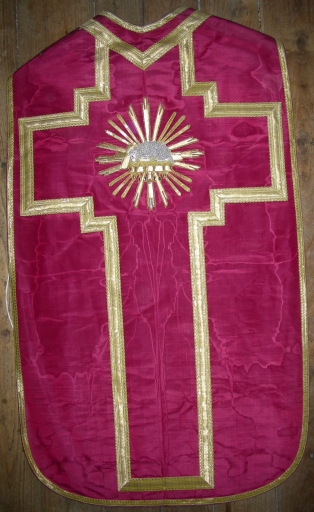 Ornement rouge 2 : chasuble, étole, voile de calice et bourse de corporal,