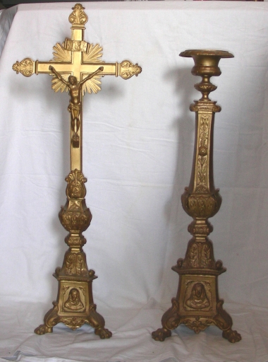 Garniture d'autel : croix d'autel et paire de chandeliers d'autel,