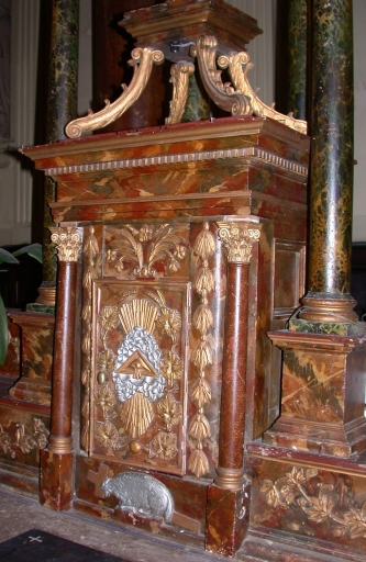 Ensemble du maître-autel : autel, tabernacle, exposition, 2 gradins d'autel, 2 degrés d'autel, baldaquin d'autel,