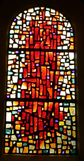 Ensemble des 7 verrières des baies 1 à 2, 5 à 8 et 00, et des 2 verrières à personnages : Vierge de Pitié (baie 3), et Saint Etienne (baie 4),
