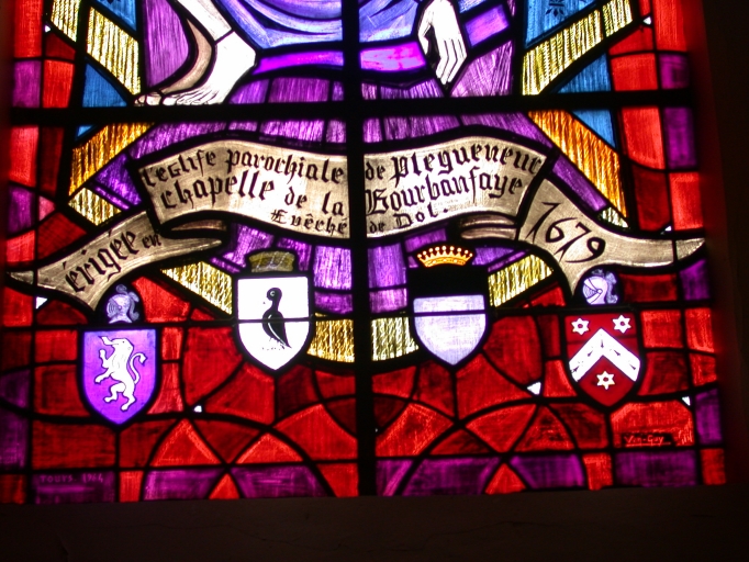 Ensemble des 7 verrières des baies 1 à 2, 5 à 8 et 00, et des 2 verrières à personnages : Vierge de Pitié (baie 3), et Saint Etienne (baie 4),