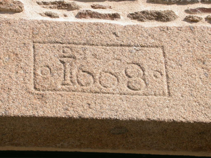 Elévation sud-ouest du logis : détail de la date gravée sur le linteau de la porteImmatriculation