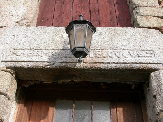 Bâtiment central, élévation sud-est : détail de l'inscription du linteau de la porteImmatriculation