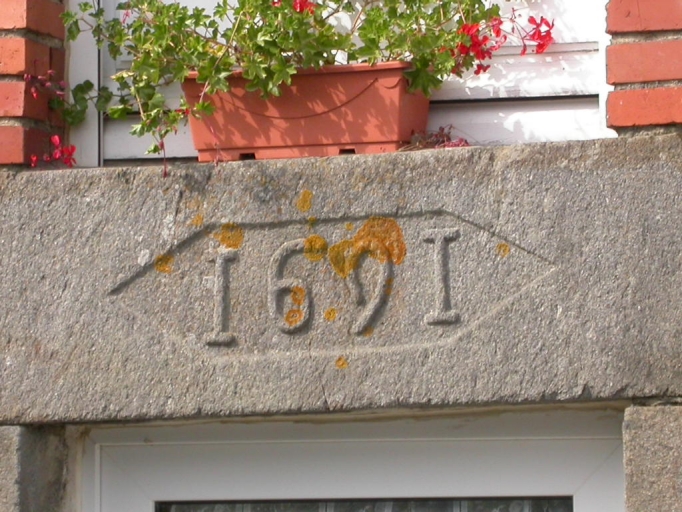 Elévation sud-est du logis : détail de la date gravée sur le linteau de la porteImmatriculation