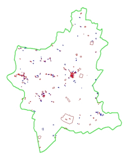 En bleu, les bâtiments non analysés ; en rouge, les bâtiments analysésImmatriculation