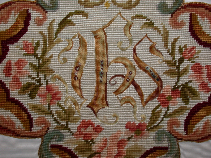 Dos de la chasuble, détail du décor central : I.H.S.Immatriculation