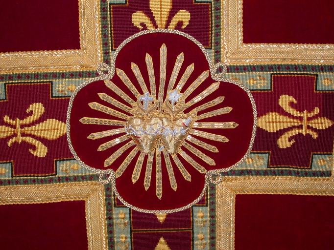 Ornement rouge 6 : chasuble, bourse de corporal, étole, manipule, voile de calice,