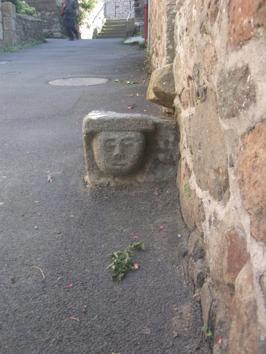 Rue le Jerzual, emmarchement sculpté d'une têteImmatriculation