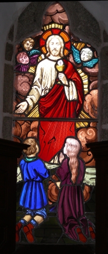 Verrière baie 1, 2, 6 et 7 : Bénédiction du Christ ; Résurrection ; Baptême du Christ, église paroissiale Saint-Martin (Javené),
