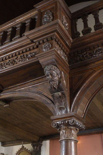 Détail partie centrale et consoles d'encorbellement sculptées.Immatriculation