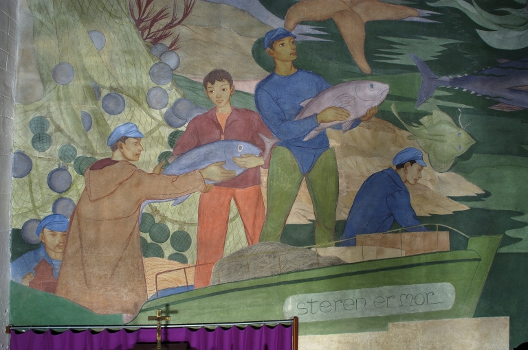 Détail en bas à gauche : pêcheurs offrant des thons.Immatriculation