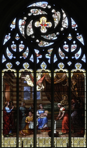 Ensemble de 3 verrières : Naissance de la Vierge ; sainte Anne, saint Joachim ; saint Pierre, saint Joseph,