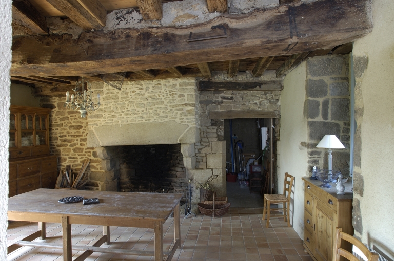 Le logis : la cuisine, la cheminée du 15e siècle et la porte qui donnait accès au celier.Immatriculation