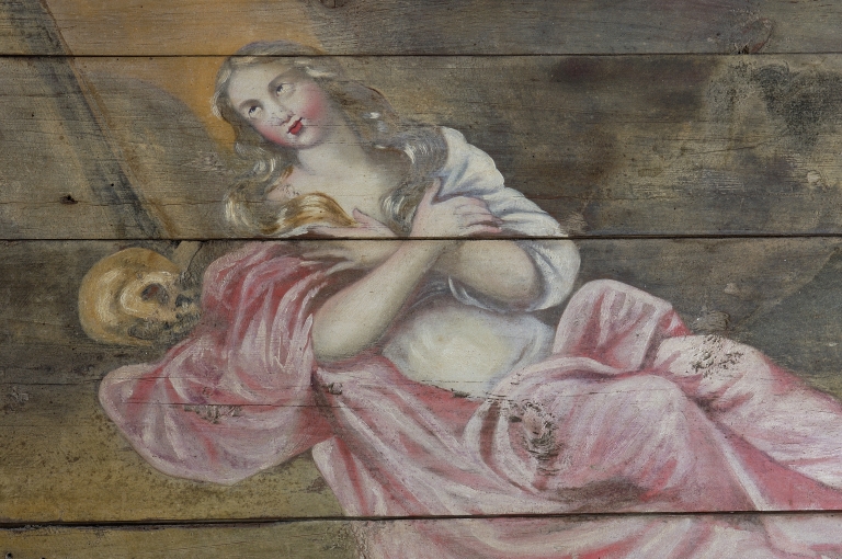 Le logis : chambre ouest, détail décor peint sur la hotte de cheminée figurant Marie-Madelaine au désert.Immatriculation
