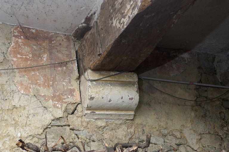 Pièce ouest, mur sud : support de poutre et vestiges de peinture murale.Immatriculation