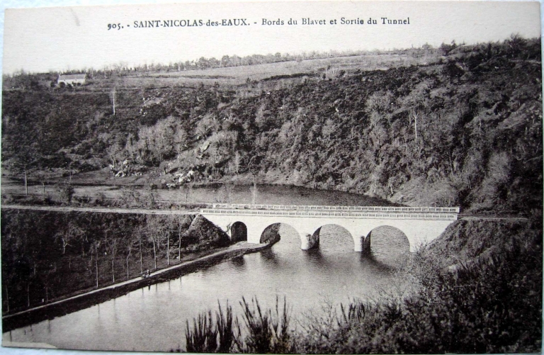 Saint-Nicolas des Eaux Bords du Blavet et sortie du Tunnel .Vers 1920. Carte postale ancienne. Coll. Laurent Nel, Rennes. AD Morbihan, 9 Fi.Immatriculation