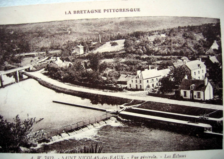 Saint-Nicolas. Vue prise de de Castennec : cheminée de l'usine, la gare, le pont de chemin de fer, l'écluse et la maison éclusière. Carte postale ancienne. AD Morbihan, 9 Fi.Immatriculation