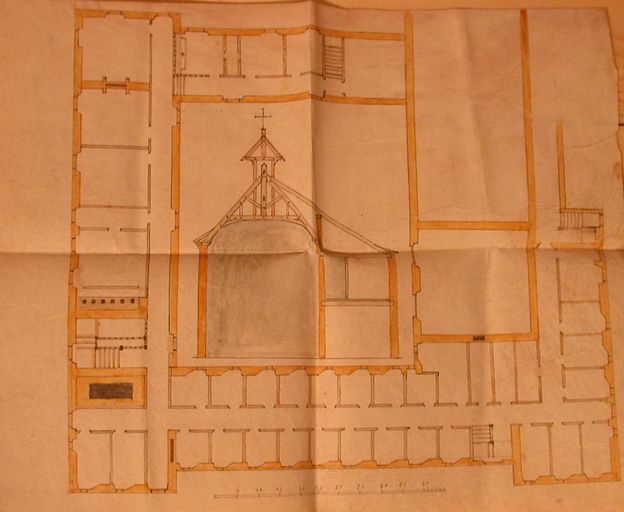 Plan du couvent des capucins 1er étage et coupe de la chapelle, 1er quart 17e siècle. AM Vannes série Z fonds Martin-Chauffier.Immatriculation