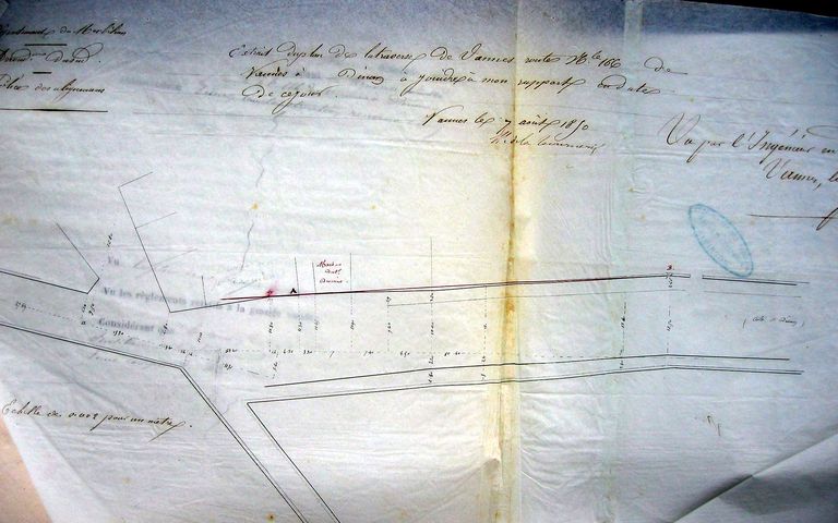 Plan dressé pour une demande d'alignement de C. Drouino désirant faire abattre une petite maison située entre sa nouvelle construction et une autre construite en 1844, le 27 juillet 1850. AD Morbihan S257.Immatriculation