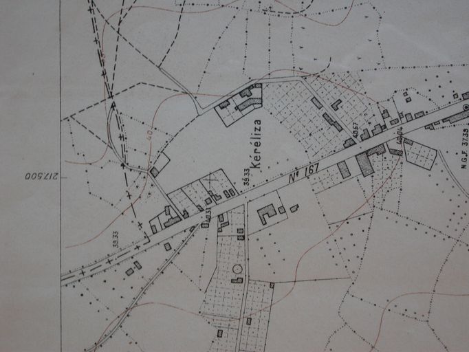 Plan de la commune par Gay, Ministère de la Reconstruction, 1952 : partie nord, route de Pontivy. AM Vannes 9Fi.Immatriculation