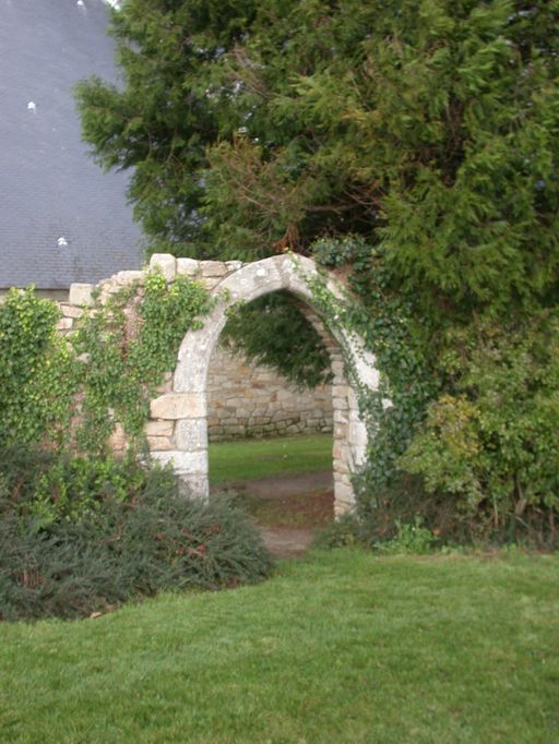 Vue de la porte dite porte Abélard (abbé de Rhuys) remontée près de l'église Saint-Guen.Immatriculation