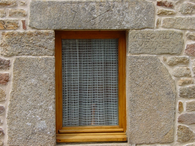 Détail façade sud du logis étable de la ferme n°2. Linteau et encadrement de fenêtre datés 1797 et gravés d'un coeur vendéen, et d'une inscription non déchiffrée.Immatriculation