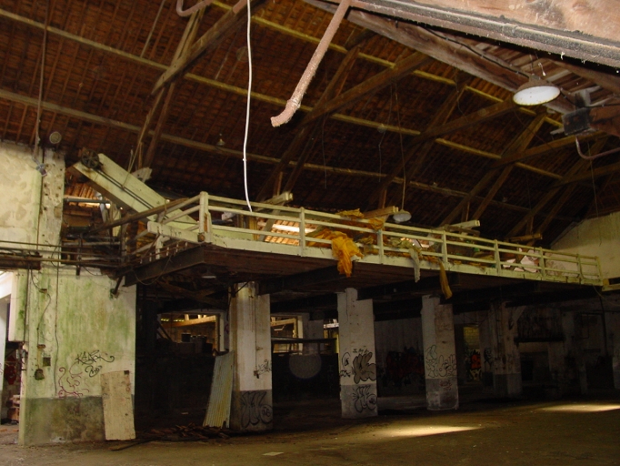 La grande halle, vue intérieure vers l'ouest. Les planchers sur poutres métalliques des galeries sont ici supportés par des piles maçonnées. Au fond, derrière le second rang de piliers : les ateliers de la petite halle ouest.Immatriculation