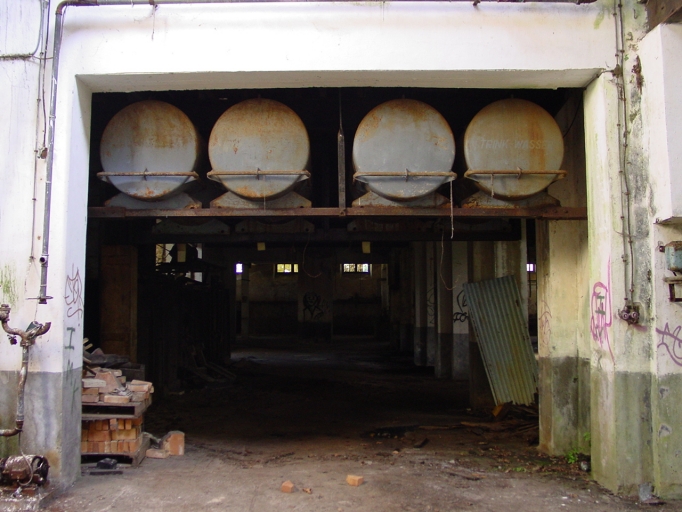 Grande halle, vaisseau ouest : au dessus d'une chaîne de remplissage des boîtes, les cuves à huile (ici huile d'olive).Immatriculation