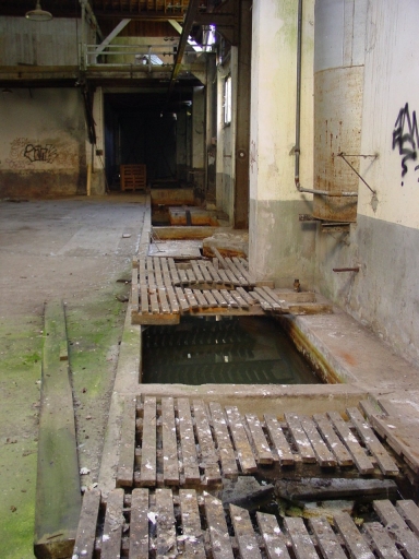La grande halle : bassins à autoclaves contre le pignon nord.Immatriculation