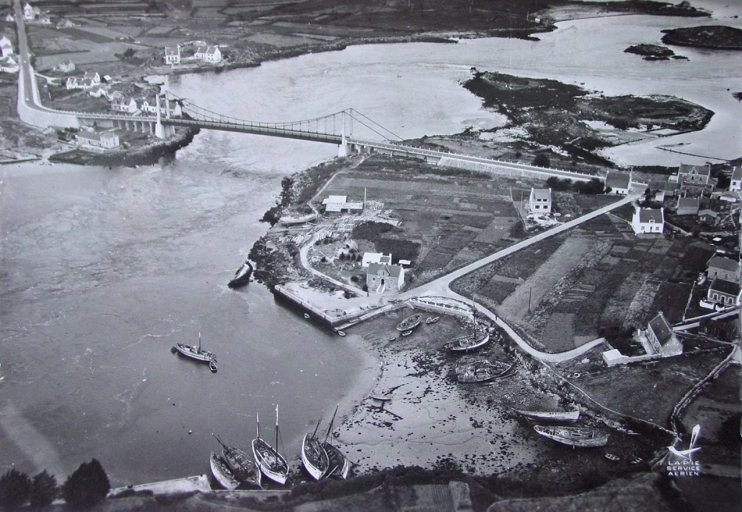 Vue aérienne au dessus de Porh Niscop vers 1959. Le fond de l'anse sert de cimetière à bateaux. Contre le terre-plein sud, bâti en 1939, d'autres thoniers attendent un proche désarmement.Immatriculation