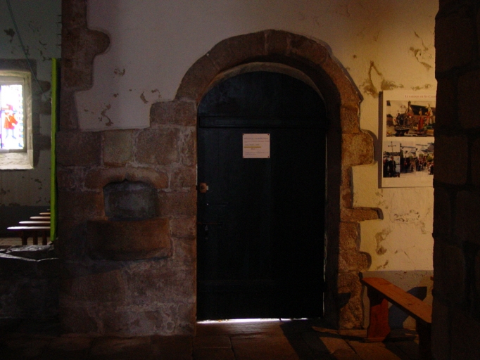 Vue intérieure de la porte sud et son bénitier encastré dans le mur.Immatriculation