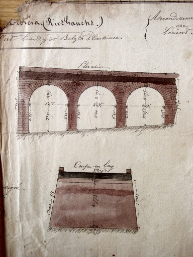 Elévation et coupe d'un projet de rampe en maçonnerie, dressé par Guillaume, agent voyer d'Auray, en 1840.Immatriculation