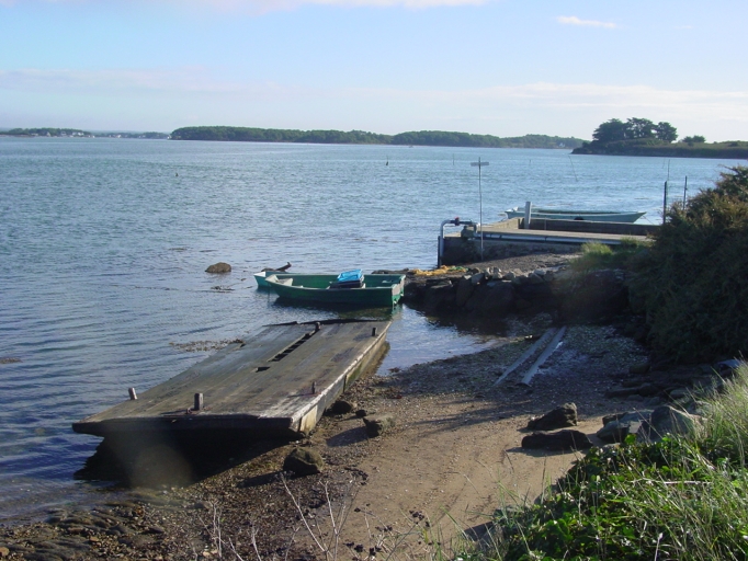 Île de Saint-Cado : cale, bassin et vieux ponton (barge) ostréicole, au nord de l'île.Immatriculation
