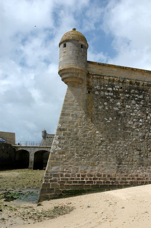 Vue de la citadelle de Port-Louis : échauguette de la demi-lune. En arrière-plan : le pont-dormant de la demi-lune et l'échauguette du bastion de GroixImmatriculation