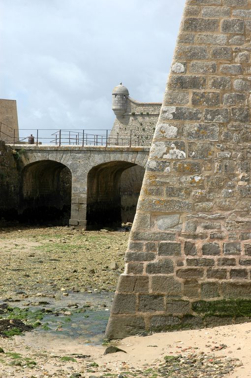 Vue de la citadelle de Port-Louis : pont-dormant de la demi-lune. En arrière-plan : l'échauguette du bastion de GroixImmatriculation