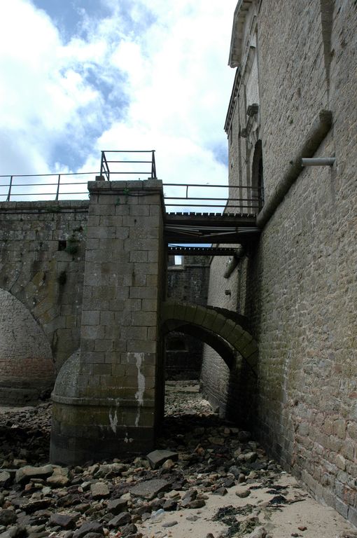 Vue de la citadelle de Port-Louis : pile du grand pont en granite permettant de franchir le canal, pont-levis et porte monumentale du corps de place. A signaler la présence de deux arcs boutantsImmatriculation