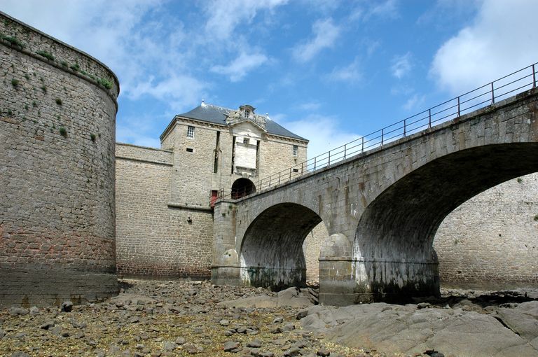 Vue de la citadelle de Port-Louis : piles du grand pont en granite permettant de franchir le canal, pont-levis et porte monumentale du corps de placeImmatriculation