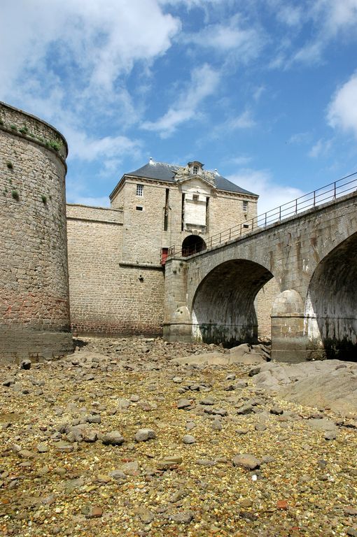Vue de la citadelle de Port-Louis : piles du grand pont en granite permettant de franchir le canal, pont-levis et porte monumentale du corps de placeImmatriculation