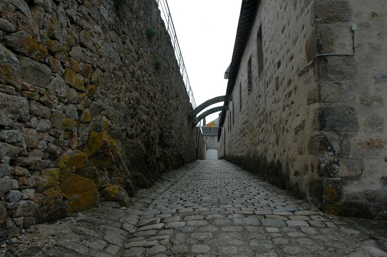 Vue de la citadelle de Port-Louis : passage situé entre le rempart et la caserne Lourmel. Arcs boutants servant de contrebutée de la charpenteImmatriculation