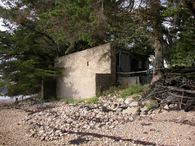 Pointe de Pen Inez, ancien chantier ostréicole repéré : baraque en planches avec mur en moellon sur la rivière, vue générale sud-ouest. XA 160aImmatriculation