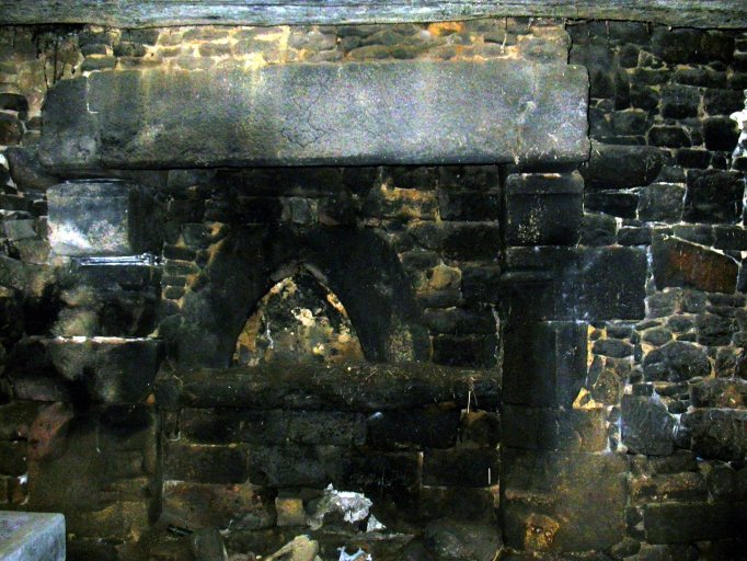Logis de prêtre, cheminée de la salle, détail du linteau gravé d'un caliceImmatriculation