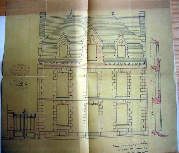 1er Août 1884 : demande de Mathurin Fraboulet architecte pour construire une maison rue du Roulage pour M. Ozo, plâtrier. Elévation, datée 1er août 1884. AD Morbihan S 246.Immatriculation