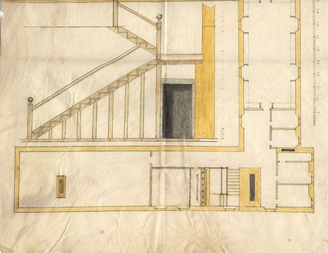 Coupe de l'escalier, aile sud, 1er quart 17e siècle. AM Vannes série Z fonds Martin-Chauffier.Immatriculation