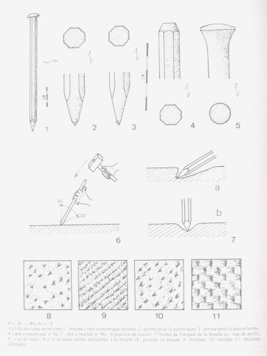 Dans : "L'outillage traditionnel du tailleur de pierre de l'Antiquité à nos jours" / Jean-Claude Bessac, Paris : Edition du CNRS, 1993.Dessin.