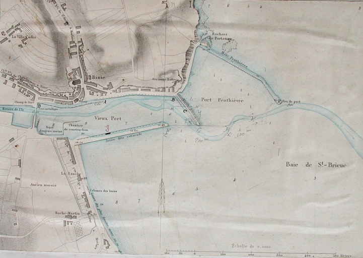 Plan du port de Binic pour l'Atlas en 1890 : remarquer la vieille jetée, l'emplacement des chantiers navals, les dépôts d'engrais marins, le pont métallique, la passerelle (AD 22)mobile, les anciens marais, la cale de la Cloche (AD 22)Immatriculation