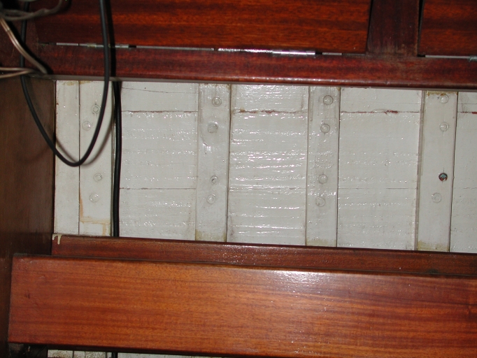 Détail de la charpente : membrures en acacia rivetées sur bordés en acajouImmatriculation