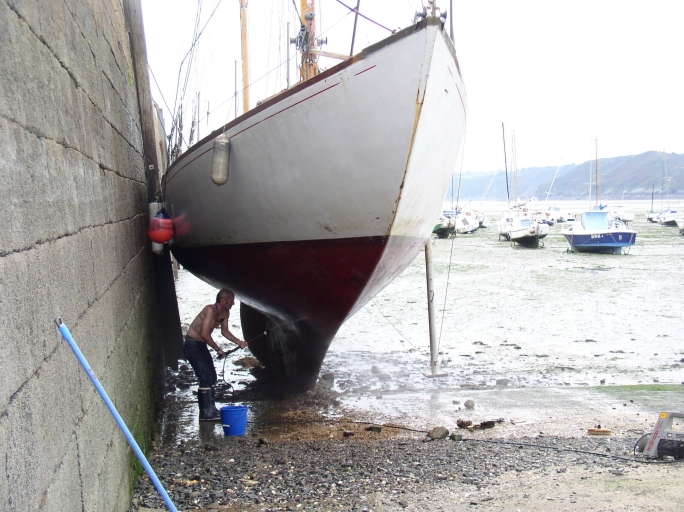 Vue des formes élancées de la coque de l''Agathe à l'échouage (Alain Guillaume)Immatriculation
