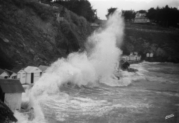 Tempête sur la plage de l'avant-port avant 1960 : remarquer les bains de bains en bois (AD 22, Fonds Joël)Immatriculation