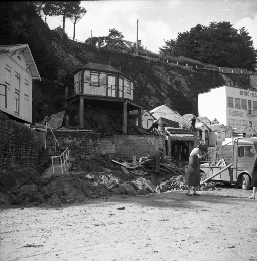 Après la tempête de 1968, le front de mer de l'avant-plage, avec la cabines de bains sur pilotis détruites et le Binic Bar (AD 22, Fonds Joël)Immatriculation