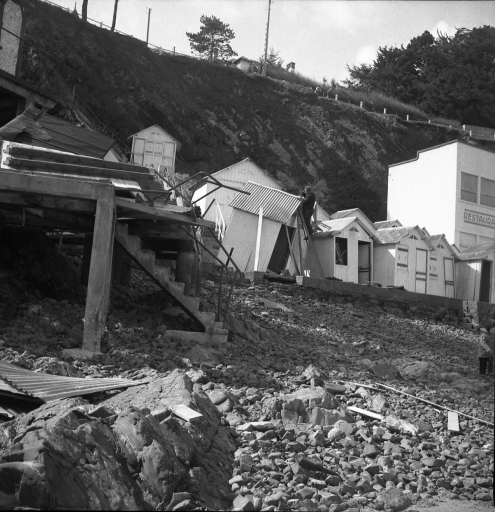 Après la tempête de 1968, le front de mer de l'avant-plage, avec la cabines de bains en bois détruites (AD 22, Fonds Joël)Immatriculation